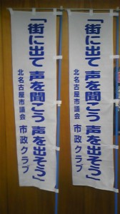 市政クラブの活動方針である「街に出て声を聞こう声を出そう」の旗ができました。 この旗印のもとに街頭演説・議会報告会などの活動をしてまいります。
